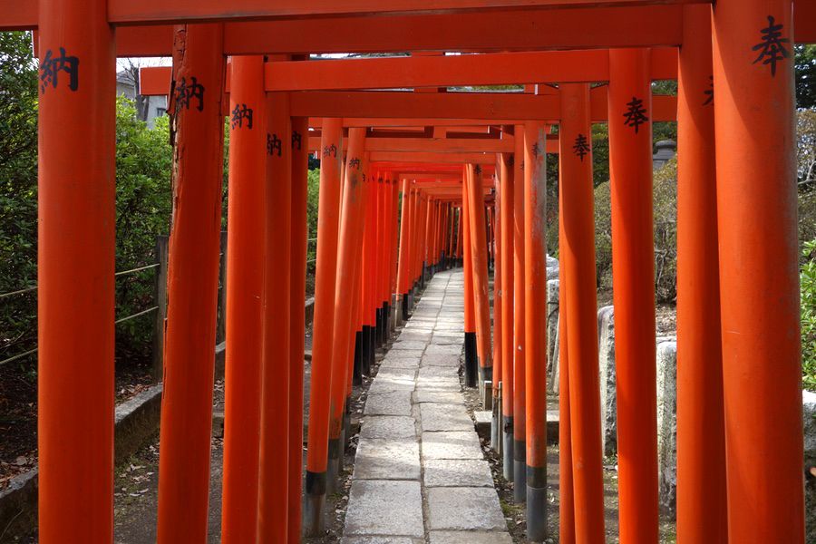 بوابات توري بلون فيرميليون تزين ممراً في ضريح نيزو بطوكيو