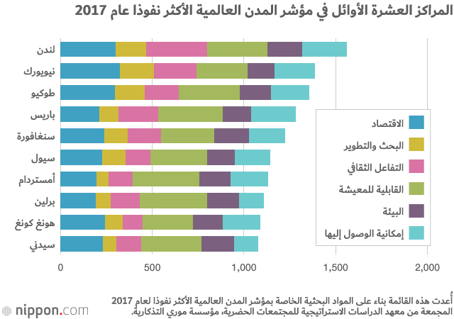 وبعد هيمنة طوكيو على الحركة الاقتصادية لمدة ست سنوات كأعلى مدينة تتمتع بنفوذ اقتصادي، انخفضت إلى المركز الرابع في تصنيف عام 2017. ويرجع ذلك جزئيا إلى ضعف مستوى الين الياباني. وسوف تحتاج طوكيو للحفاظ على قوتها الاقتصادية لتبقى قادرة على المنافسة في القائمة، إلا أنها اقتربت من نيويورك في الترتيب العام، وربما قد ترتفع إلى المرتبة الثانية في القوائم المستقبلية.