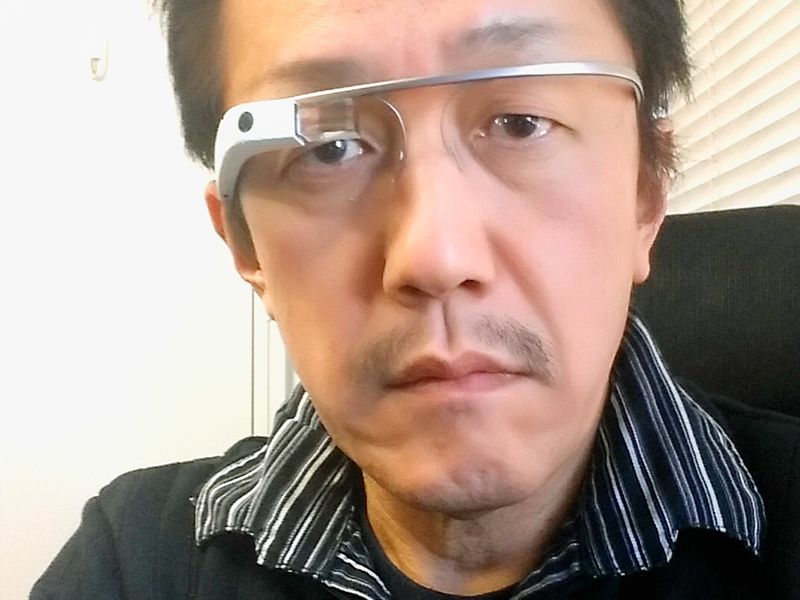 الكاتب يرتدي ”نظارات غوغل“. يتم ارتداء هذه الشاشة على شكل نظارات وتعرض المعلومات في جزء من مجال الرؤية. يستخدم الكاتب التكنولوجيا التي يمكن ارتداؤها في حياته اليومية منذ حوالي ١٤ عاما. (الصورة مقدمة من: تسوكاموتو ماساهيكو)
