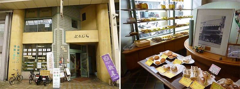 الوجهة الخارجية لمقهى ”روإيه برازيل“ (على اليسار). داخل المقهى في آخر الطاولة المعروض عليها الخبز اليدوي الصنع هناك صورة للمقهى من ”عام ١٩٥٦“.