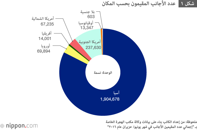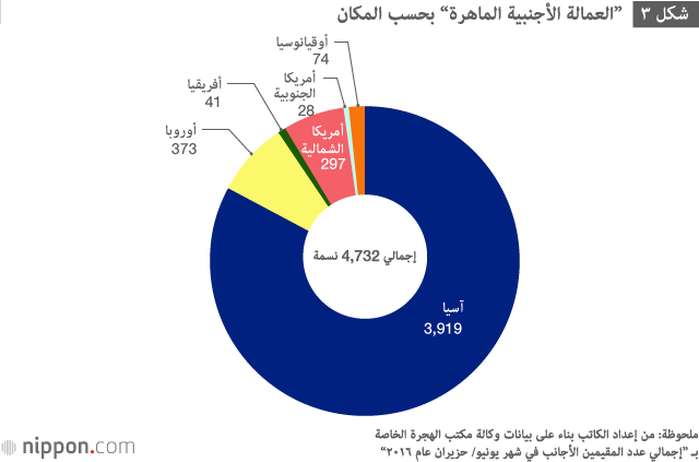 ووفقًا لإحصائيات وكالة مكتب الهجرة (شهر يونيو/ حزيران عام ٢٠١٦) فقد بلغ ”إجمالي عدد الأجانب المقيمين“ الـ ٢.٣ مليون أجنبي. ففي مختلف المناطق نجد أن هناك ١.٩ مليون أجنبي من قارة آسيا، يمثلون أكثر من ۸٠ بالمائة من إجمالي عدد الأجانب المقيمين (شكل ١). وأيضًا ما إن نظرنا في تصنيفات القادمون من قارة آسيا حتى نجد أن هناك ٦٧٧٥٧١ شخصاً أجنبياً يحملون الجنسية الصينية ويمثلون ٣٥ بالمائة (شكل ٢). ونجد أن حاملي الجنسية الصينية يمثلون ٣٠ بالمائة من بين إجمالي عدد ٢.٣ مليون أجنبي (شكل ٢). وعلى الجانب الآخر يمثل الأمر برمته ”العمالة الأجنبية الماهرة“، ولكن نجد أن إجماليهم حاليًا البالغ ٤٧٣٢ عامل من القارة الآسيوية يمثلون أكثر من ۸٠ بالمائة (شكل ٣) بما فيها نسبة حاملي الجنسية الصينية بنحو ٦٥ بالمائة من الإجمالي.