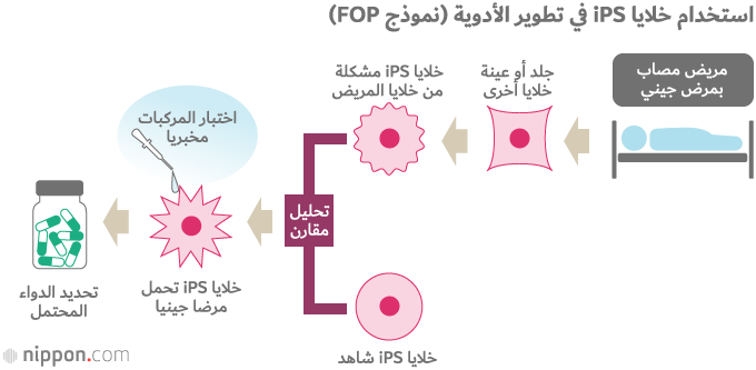 بدأ فريق توغوتشيدا بإعادة برمجة خلايا iPS بنجاح من خلايا مرضى مصابين بـFOP. وبمقارنة تلك الخلايا مع خلايا iPS شاهد خالية من طفرات مرض FOP، وجد الباحثون أن خلايا FOP تظهر قدرة أكبر بكثير على تشكيل العظام وحدوث ترسبات معدنية في التجربة المخبرية، واستطاعوا تحديد مسارات حيوية رئيسية في آلية التشكل الشاذ للعظام. وبهذه الطريقة، قاموا بصنع ’’نموذج عن المرض في طبق مخبري‘‘ بدون الحاجة لاستخدام نماذج من حيوانات مخبرية. وباستخدام خلايا iPS لفحص فعالية نحو 6.8 ألف مركب، وجد الباحثون أن المثبط المناعي ’’رابامايسين‘‘ يمنع التشكل الشاذ للعظام.
