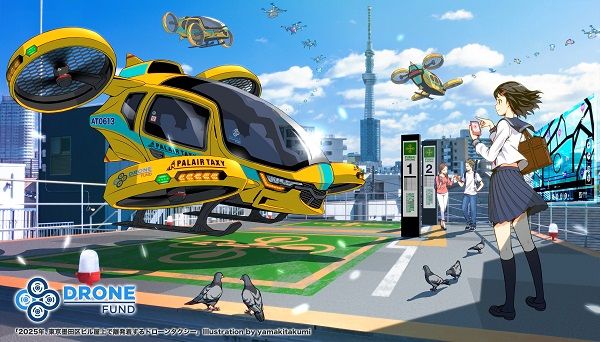 أحد الرسومات التوضيحية الصادرة عن أحد البيانات الصحفية المشتركة حول ثورة النقل الجوي يظهر فيها التاكسي الطائر الذاتي القيادة فوق بناية شاهقة في طوكيو.