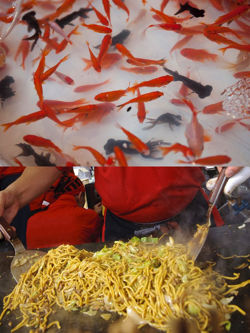 إلتقاط الأسماك الذهبية (Kingyo-sukui)(الأعلى)(المصور: كوديرا كي)، ياكيسوبا (المصور: توني ماكنيكول)(Yakisoba).