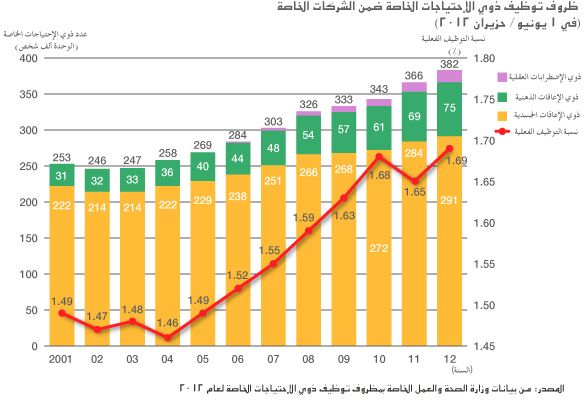 وفقا للإحصائيات الصادرة من وزارة الصحة والعمل عن ”ظروف توظيف ذوي الاحتياجات الخاصة لعام ٢٠١٢“، فقد زاد عدد العاملين من ذوي الاحتياجات الخاصة بالشركات الخاصة لـثلاثمائة وثمانين ألف فرد أي زيادة بنسبة ٤٫٤٪ عن العام الماضي. وبلغت نسبة التوظيف الفعلي نحو ١٫٦٩٪. وكما إن نسبة الشركات التي التزمت بالنسبة المحددة بالقانون ألا وهي (١٫٨٪) كانت ٤٦٫٨٪ أي أقل من النصف (وذلك في ١ يونيو/حزيران ٢٠١٢) وهي أعلى نسبة بلغتها حتى الآن. فقد ارتفعت بدورها نسبة توظيف ذوي الاحتياجات في الشركات الكبرى، ولكن لا تزال النسبة ضعيفة لدى الشركات الصغيرة والمتوسطة ولا يزال أمامها الكثير. وذلك وفقا لنائب رئيس قسم دعم توظيف المسنين والمعاقين بـ يوساوا تشييه كوريه.