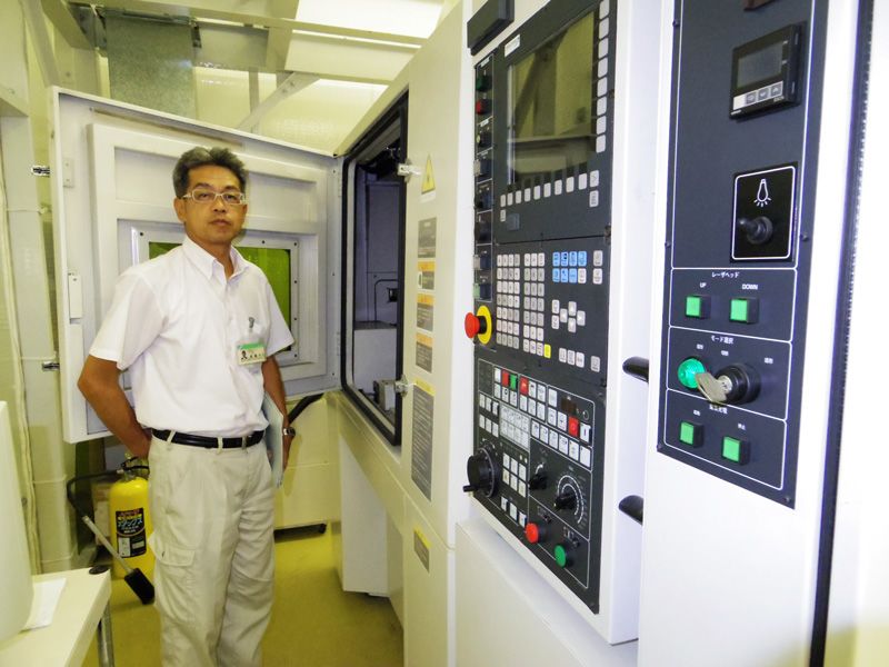 c00619_ph02 غوتو موتوهيرو رئيس الباحثين يقف إلى جانب النموذج الأولي لآلة لوميكس في مخبر التطوير بمركز التكنولوجيا الصناعية في محافظة فوكوي.