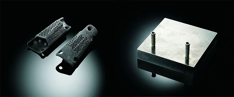 عظمتان من التيتانيوم حسب الطلب (يسار) وزرعتان (يمين) مصنوعة باستخدام آلة لوميكس. (الصورتان بإذن من ماتسوؤرا لصناعة الآلات).