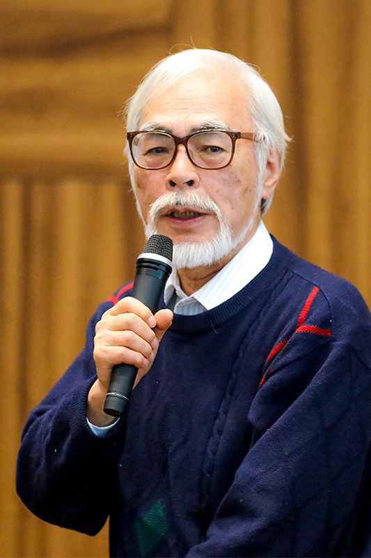 ميازاكي هاياو في مؤتمر صحفي بعد إلقاء كلمته.