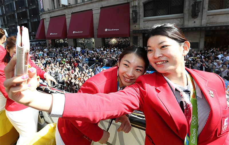 تاكاهاشي أياكا (يمين) تأخذ صورة سيلفي مع ماتسوموتو ميساكي خلال موكب النصر للفائزين بالميداليات الأولمبية في جينزا بطوكيو، ٧ أكتوبر/تشرين الأول. جيجي برس.