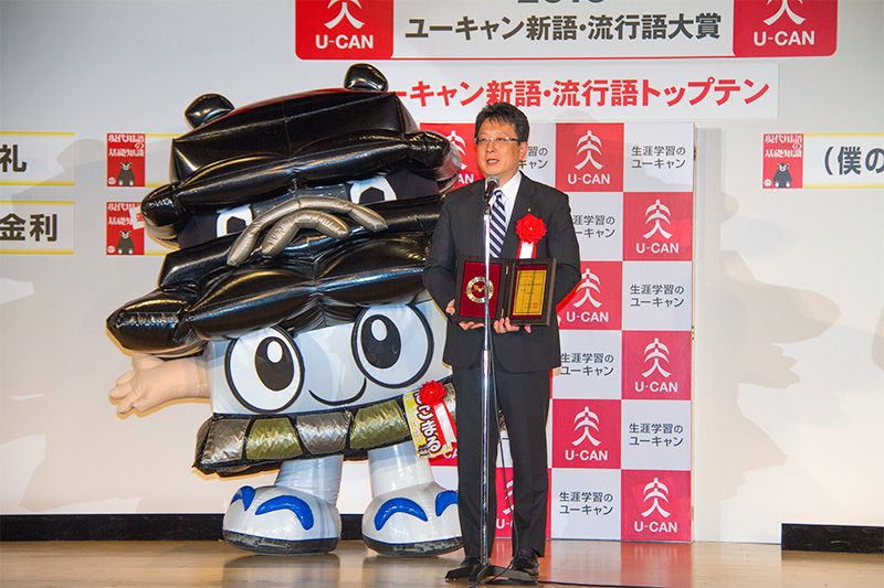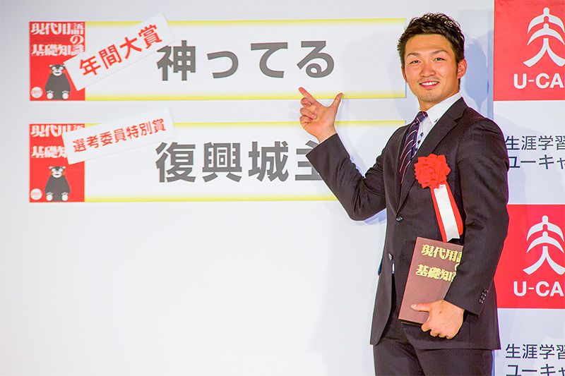 منحت جى يو كوكومين شا تقديرا خاصا لـ 復興城主 Fukkōjyōshu. تم تأسيس برنامج لجمع التبرعات لدعم ترميم قلعة كوماموتو التاريخية في أعقاب سلسلة من الزلازل المدمرة في أبريل/ نيسان. وفي الصورة محافظ كوماموتو أونيشي كازوفومي وتميمة المحافظة هيكومارو يتسلمان الجائزة.