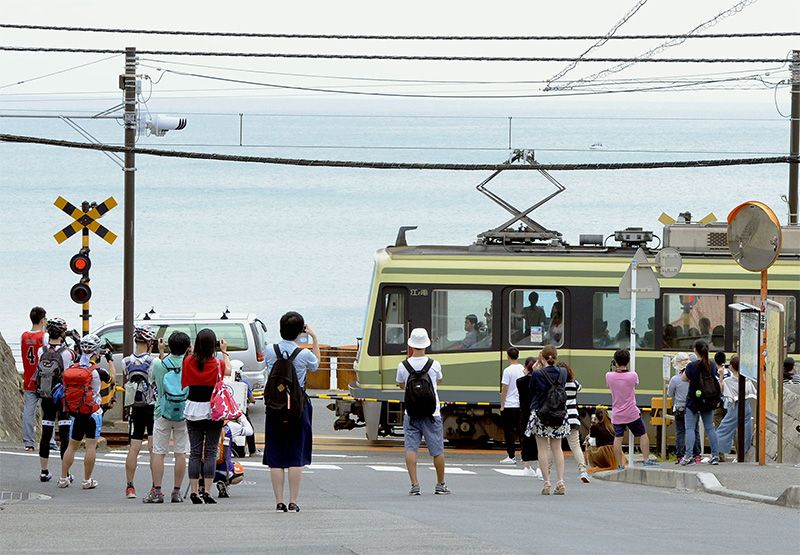 سائحون يتجمعون عند معبر للسيارات بالقرب من محطة كاماكورا كوكو مائي على إينوشيما للسكك الحديدية الكهربائية في كاماكورا. وقد أصبح الموقع مقصدا سياحيا بعد إصدارات المانغا والأنيمى ”سلام دانك“ المتعلقة بكرة السلة. الصورة من يوميوري شيمبون/ أفلو.