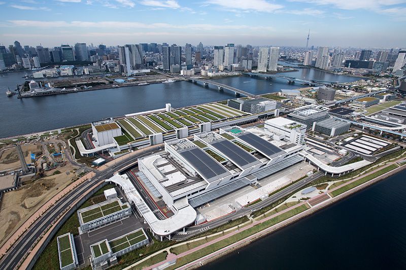 سوق السمك الجديد الذي بني حديثا في تويوسو بخليج طوكيو، الصورة يوم ١٢ أكتوبر/ تشرين الأول. تم تأجيل خطط نقل السوق القديم من تسوكيجي للموقع الجديد بسبب تلوث التربة وغيرها من الأمور الأخرى ذات الصلة. الصورة من جيجي برس.