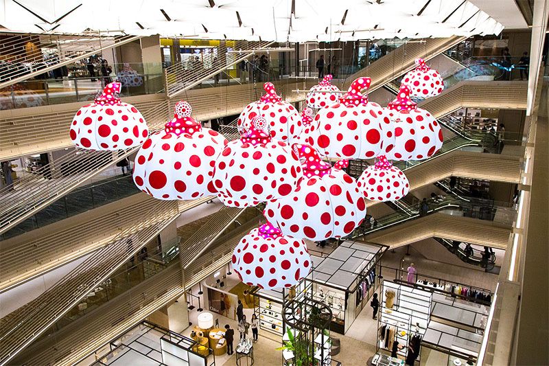يستمتع المتسوقون بجينزا سيكس بهذا التشكيل الفني من عمل الفنان كاسوما يايوي في البهو. الأوسط بالمبنى.