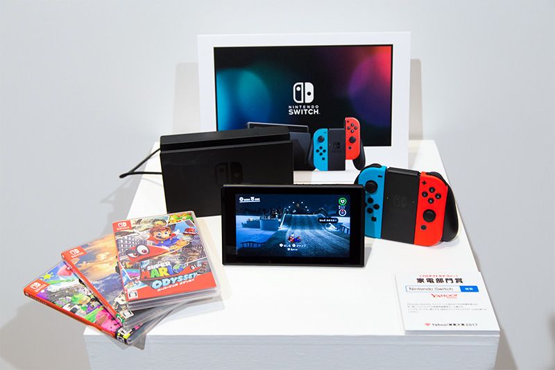 جهاز ألعاب الفيديو ”Nintendo Switch“ الحاصل على جائزة فئة الأجهزة الكهربائية هو جهاز للألعاب يتغير شكله بما يتناسب مع مشاهد اللعب في داخل أو خارج البيت وغيرها من الأماكن، قامت شركة نينتيندو بطرحه للبيع في الأسواق في شهر مارس/آذار. أصبح من الصعب شراءه بسبب شهرته الكبيرة. (تقديم= مكتب الجائزة الكبرى للبحث في Yahoo! لعام 2017)