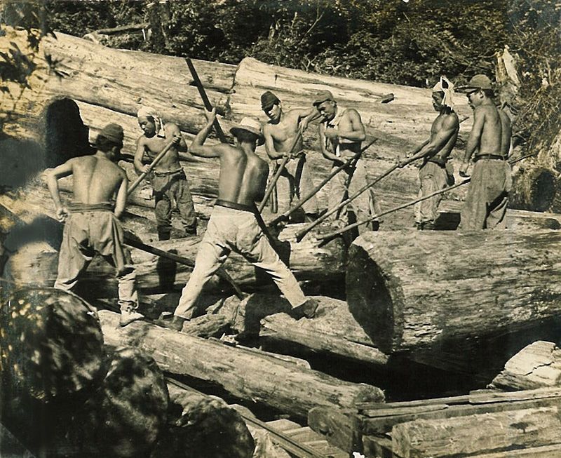 عمال يجمعون جذوع ياكوسوغي في كوسوغيداني في أوائل سنوات ما بعد الحرب. الصورة: مركز ياكوشيما للحفاظ على النظام البيئي للغابات التابع لوكالة لغابات.
