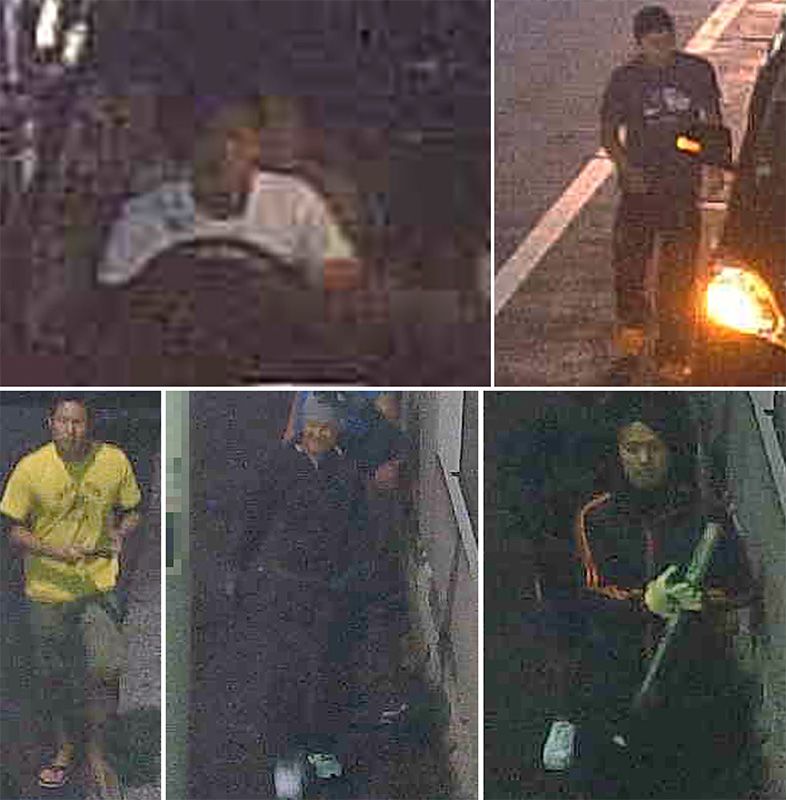 صور مشتبه بهم التقطت بكاميرات أمنية كانت في الجوار بعد هجوم النادي في روبّونغي. وتظهر الصورتان في الأعلى سائقين، بينما الصور في الأسفل فتظهر ثلاثة رجال اشتركوا فيما يبدو في الاعتداء. الصور ملتقطة في حوالي الساعة 3:40 صباحا بتاريخ 2 سبتمبر/أيلول 2012. (الصور من قسم شرطة العاصمة طوكيو، جيجي برس).