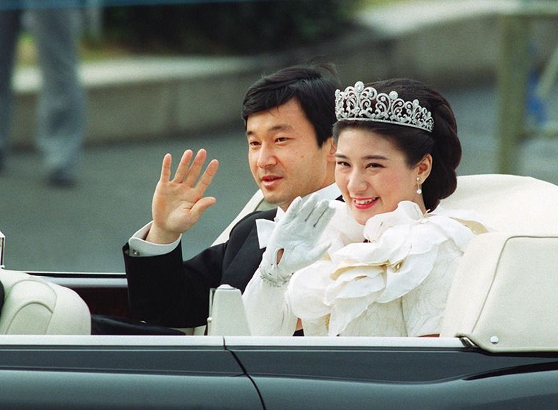 ولي العهد الأمير ناروهيتو وزوجته الأميرة ماساكو يلوحان للجماهير خلال موكب بمناسبة زواجهما بطوكيو في يونيو/حزيران عام 1993 (حقوق الصورة لجيجي برس).