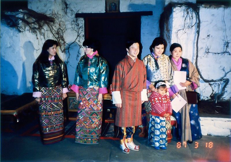 ولي العهد الأمير ناروهيتو يرتدي زيا تقليديا بوتانيا في مأدبة أقيمت في القصر. الملكة الأم كيسانغ تشودين على يمين الصورة الملتقطة في مارس/آذار من عام 1987 (الصورة بإذن من سايتو كاتسوهيسا).
