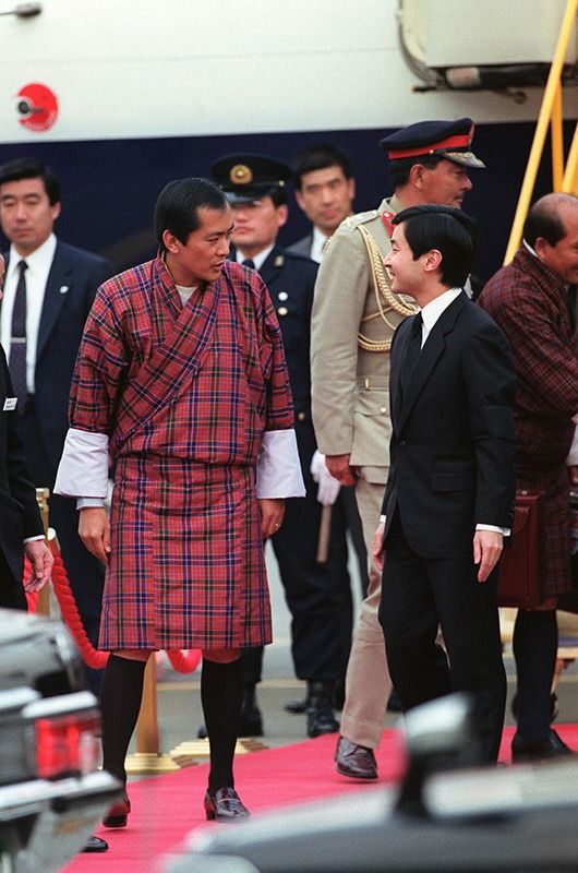 ولي العهد الأمير ناروهيتو يحيي الملك جيغمي سينغي وانغشوك في مطار ناريتا بطوكيو في 22 فبراير/شباط عام 1989، قبيل مراسم تشييع الإمبراطور شووا.