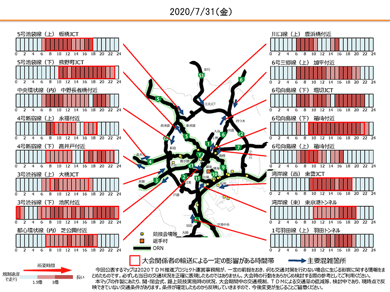 فتظهر التوقعات لخريطة الحادي والثلاثين من يوليو/ تموز 2020، ما ستكون عليه حركة المرور خلال ساعات أحد الأيام الاعتيادية لدورة الألعاب. فما بين الساعة التاسعة صباحًا والتاسعة مساءً، من المتوقع أن تستغرق المركبات التي تسير بحد السرعة المسموح ثلاثة أضعاف الوقت المعتاد للعبور حول منطقة (هاكوزاكي) في قلب طوكيو في الحارات المتجهة لخارج المدينة على طريق (موكوجيما) السريع المدار من قبل شركة طوكيو للطرق السريعة. ومن المتوقع أن يتم تنفيذ تصور مشابه في جميع المناطق الستة عشر التي تظهر على الخريطة، بما في ذلك الشرايين الحيوية كالحارات المتجهة إلى داخل المدينة على طريق (اكيبوكورو) بالقرب من تقاطع طرق منطقة (إيتاباشي) وحركة المرور على الحارات المتجهة لخارج المدينة حول منطقة (إكيجيري) على طريق شيبويا.