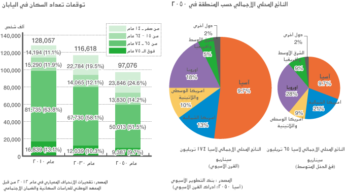 بحلول ٢٠٥٠ سيكون تعداد السكان في اليابان الذين يتجاوزون الـ ٦٥ عام ٣٨٫٨ ٪ و الذين يتجاوزون الـ ٧٥ عام ٢٤٫٦٪. إذا كان نمو آسيا سيستمر حتى ٢٠٥٠ فإن الناتج المحلي الإجمالي سيمثل نصف ما هو عليه في العالم وبذلك ستتمكن آسيا من تفادي خطر الوقوع في فخ (الدخل المتوسط)