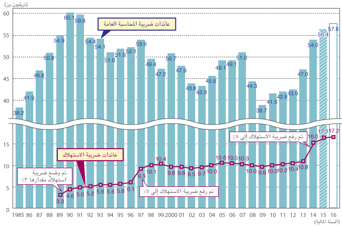 | ديسمبر/كانون الأول ١٩٨٨ | تم تمرير مشروع ضرائب الاستهلاك تحت إدارة رئيس الوزراء تاكيشيتا نوبورو. |