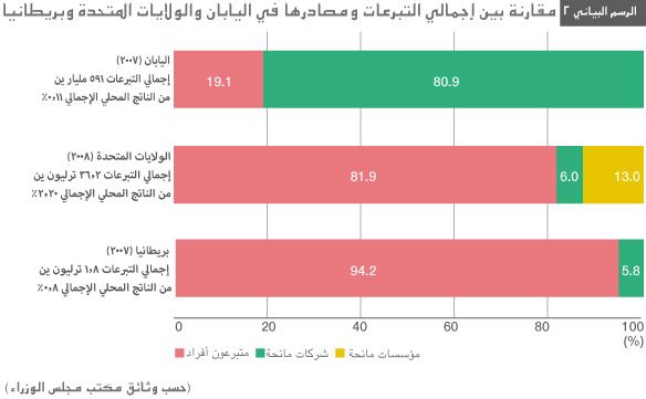 ووفق حسابات مكتب مجلس الوزراء الياباني (رسم بياني ٢) فإن التبرعات الإجمالية في اليابان في ٢٠٠٧ بلغت ٥٩١ مليار ين وهو ما يشكل ٠٫١١٪ من الناتج المحلي الإجمالي الاسمي في ذلك العام. وهذا المبلغ هو أقل بـ ٦٠٠ مليار ين من إجمالي التبرع الفردي في أعقاب زلزال ١١ مارس/آذار ٢٠١١. هذا وتسبق الولايات المتحدة وبريطانيا معاً اليابان بأميال فيما يتعلق بالتبرعات، فقد بلغت التبرعات ١٫٨ ترليون ين (٠٫٨٪ من الناتج المحلي الإجمالي الاسمي و٣٦٫٢٪ ترليون ين (٢٫٢٪ من الناتج المحلي الإجمالي الاسمي) للبلدين على التوالي.