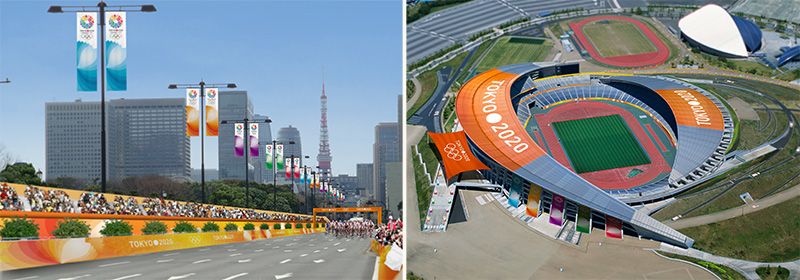 ستبدأ مسابقات دراجات الطرق من حديقة القصر الملكي (اليسار). وكذلك سيتم عقد عدد من الفعاليات الأولمبية خارج طوكيو وستشمل مدنا هي سابورو ويوكوهاما واستاد مياغي الموجود في المنطقة التي تضررت بالزلزال والتسونامي عام ٢٠١١ (اليمين).