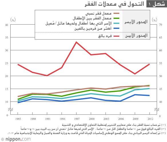 (*١) ^ ”مُعَدّلّ الفقر النسبي“ النِسبة المئوية للأشخاص الذين لا يحصلوا على دخل صافي لا يتجاوز مستوى معين (خط الفقر). وحسبت الوزارة بناء على معايير منظمة التعاون الاقتصادي والتنمية. في حالة عام ٢٠١٢، يشير إلى النسبة المئوية للأشخاص الذين لا يتجاوز دخلهم ١٢٢٠٠٠٠ ين.