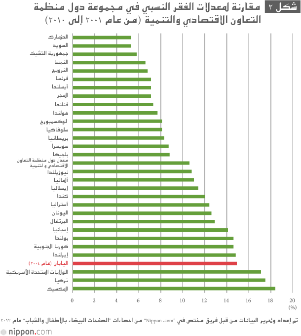 وهكذا فإن معدل الفقر في اليابان مرتفع حتى عند المقارنة مع دول العالم الأخرى. وفقاً لإحصاءات منظمة التعاون الاقتصادي والتنمية (OECD)، حلت المكسيك (حوالي ١٨.٥٪) في المرتبة الأولى في معدل الفقر النسبي بين البلدان الأعضاء الـ ٣٠ في المنظمة في منتصف العقد الماضي، تليها تركيا (حوالي ١٧.٥٪)، ثم الولايات المتحدة الأمريكية (حوالي ١٧٪)، وجاءت اليابان في المركز الرابع (حوالي ١٥٪). وكان معدل الفقر في الدنمارك هو الأدنى (حوالي ٥٪). مما يعني أن معدل الفقر النسبي في اليابان في ارتفاع مطرد منذ منتصف العقد الماضي وهو أعلى من متوسط منظمة التعاون الاقتصادي والتنمية. وفي طبعة عام ٢٠١٢ من ”الصفحات البيضاء للصحة والعمل والرعاية الاجتماعية“ ومقارنة مع الدول الأخرى في مؤشر ”المساواة“، جاءت اليابان كما يلي: (١) ارتفاع معدل الفقر النسبي كما وأنه يتخذ اتجاها نحو الزيادة، (٢) ظل معامل ”جيني“(*٣) أعلى من المعدل الوسطي لبلدان منظمة التعاون الاقتصادي والتنمية، (٣) الفروق بين الذكور والإناث من معدل العمالة كبيرة، كما أن نسبة الفترة الطويلة للعاطلين عن العمل أعلى من المعدل الوسطي لمنظمة التعاون الاقتصادي والتنمية، (٤) نسب التفاوت في الأجور بين الرجال والنساء كبيرة. وبالتالي فإن مؤشر ”المساواة“ في اليابان الذي يعكس ”درجة من الاستقلال الاجتماعي للفرد وتكافؤ الفرص وتوزيع الدخل، يشير بدوره أيضاً إلى أن الأداء بشكل عام منخفض“ (الصفحات البيضاء لوزارة الصحة والعمل والرعاية الاجتماعية). وبغية حل هذا التفاوت الاقتصادي، بما في ذلك الفجوة في الدخل، يتوجب القيام بفحص شامل بما في ذلك طبيعة العمل وحماية المعيشة والمعاشات التقاعدية العامة وتوفير الحد الأدنى للأجور. وكذلك اتخاذ تدابير لوقف تطور التفاوت الاجتماعي الذي هو أحد القضايا الملحة بالنسبة لليابان في الوقت الحالي.