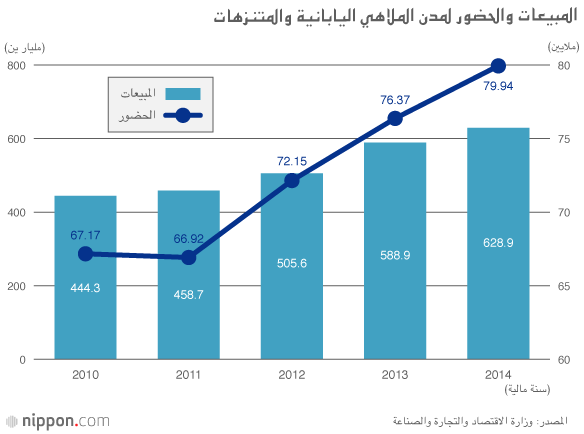 ووفقا لمسح أجرته وزارة الاقتصاد والتجارة والصناعة، فقد سجلت مدن الملاهي في اليابان مبيعات قُدِّرت بـ ٦٢٨.٩ مليار ين في السنة المالية ٢٠١٤، متخطية بذلك حاجز الـ ٦٠٠ مليار ين للمرة الأولى كما كان رقم المبيعات في عام ٢٠١٤، والذي تخطى إجمالي العام السابق بنسبة ٦.٨٪، هو الأعلى على الإطلاق منذ بدأ المسح السنوي عام ٢٠٠٠.