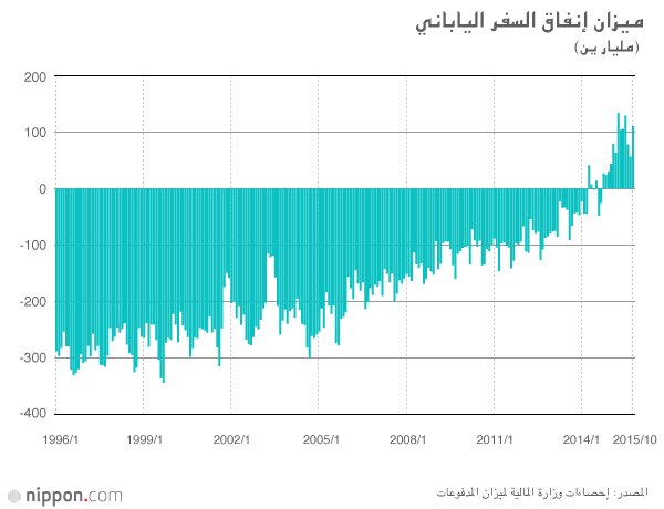 ويمثل هذا الرقم الفائض الأول لليابان في إنفاق السفر خلال العقدين الماضيين منذ بدأت وزارة المالية حفظ البيانات في عام ١٩٩٦. وعلى أساس السنة المالية اليابانية الذي يجمع البيانات في وقت سابق، تحول الإنفاق في السنة المالية ٢٠١٤ نحو وضع مصرفي سليم بعد ٥٥ عاما في منطقة العجز.