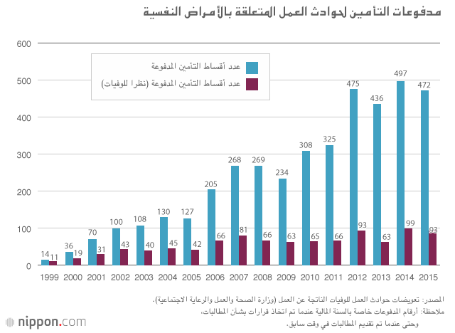 وتراجعت المدفوعات في حالات الوفاة الناتجة عن قصور في القلب أو الدماغ قليلاً منذ العقد الماضي. وعلى النقيض من ذلك ارتفعت تدريجيا التعويضات المتعلقة بالوفيات الناتجة عن الأمراض النفسية. في عام ٢٠١٥، كان هناك ١٥١٥ حالة حيث سعى المطالبون للحصول على دفعات تأمين العمل بسبب الاكتئاب وغيرها من الأمراض النفسية الناجمة عن العبء النفسي الثقيل من جراء العمل. وهذه قفزة كبيرة تصل إلى ١٠ أضعاف عدد المطالبات التي حدثت في عام ١٩٩٩.