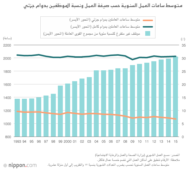 في عام ٢٠١٤، أمضى الموظفون اليابانيون في المتوسط ما معدله ١٧٤١ ساعة في العمل. وهذا العدد من الساعات أقل قليلاً من عام ١٩٩٥، عندما كان المتوسط على مدى ١٩٠٠ ساعة، لكنه لا يزال أطول بكثير من العديد من الدول الغربية. هذا الانخفاض هو إلى حد كبير نتيجة لزيادة نسبة العاملين بدوام جزئي في القوى العاملة، وعلاوة على ذلك، ما زال العاملون بدوام كامل يمضون في العمل حوالي ٢٠٠٠ ساعة سنوياً.