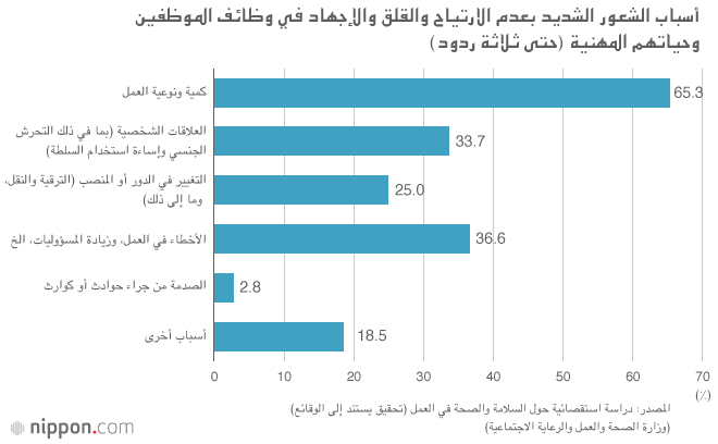 في دراسة استقصائية مستقلة متعلقة بصحة الموظف أجريت من قبل وزارة الصحة والعمل والرعاية الاجتماعية في عام ٢٠١٣، أفاد ٥٢.٣٪ من العمال أن لديهم شعور شديد بعدم الارتياح، القلق، والإجهاد في وظائفهم وحياتهم المهنية. كما طلب من المشاركين الاستشهاد بثلاثة أسباب لحالتهم، وكانت ”نوعية وكمية العمل“ السبب الأبرز الذي اختاره ٦٥.٣٪ من المستطلعين، متقدما بفارق كبير على”الأخطاء في العمل“ و”العلاقات الشخصية“.