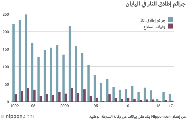 أعلنت وكالة الشرطة الوطنية أنه في عام 2017 كان هناك 22 جريمة إطلاق نار فقط في جميع أنحاء اليابان. وتُعرَّف هذه الحوادث بأنها حالات يتسبب فيها أشخاص يحملون أسلحة نارية في وفاة، جرح، أو خسائر في الممتلكات، ولكنها تثتني الحوادث الخطأ والانتحار. وكان أعضاء منظمات الجريمة المنظمة هم الجناة في 13 من هذه الجرائم. حيث قتل 3 أشخاص وأصيب 5 أشخاص بجروح جراء تلك الحوادث.