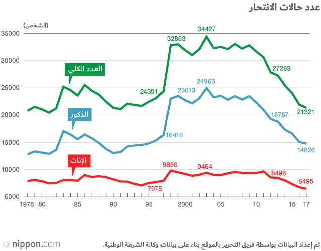 طبقا لبيانات وكالة الشرطة الوطنية فهناك 21321 شخص في اليابان قد أقدموا على الانتحار في عام 2017. ويمثل هذا الرقم انخفاضا بما يوازي 576 حالة مقارنة بعام 2016 وهو التراجع السنوي الثامن على التوالي في عدد حالات الانتحار. فقد انخفض عدد النسوة اللواتي أقدمن على الانتحار إلى 6495 وذلك في تراجع قياسي للعام الثاني على التوالي وهو الأدنى منذ عام 1978 حين بدأ تدوين البيانات المتعلقة بالانتحار. أما بالنسبة للرجال، فعلى الرغم من أن عدد حالات الانتحار بينهم أعلى بما يوازي 2.3 مرة مقارنة بالنساء، إلا أنه يواصل اتخاذ منحى متناقص حيث بلغ العدد الإجمالي 14826 حالة. وبالنظر إلى الأسباب والدوافع، فإن العامل الأكثر شيوعا للانتحار كان المشاكل الصحية تأتي بعدها قضايا اقتصادية ومعيشية ومشاكل عائلية ومشاكل متعلقة بالعمل.