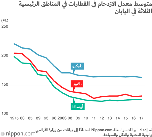في المناطق الحضرية الكبرى الثلاث في اليابان، كان متوسط معدل الازدحام في القطارات 163% لخطوط قطارات يبلغ عددها 31 خطًا في طوكيو الكبرى، و125% لخطوط قطارات يبلغ عددها 20 في أوساكا، و131% لخطوط قطارات يبلغ عددها 8 حول ناغويا. في الوقت الذي أحرزت فيه كل من أوساكا وناغويا بعض التقدم في التخفيف من حدة ازدحام القطارات، لا يزال متوسط معدل الازدحام في طوكيو أعلى بنسبة 30 نقطة مئوية.