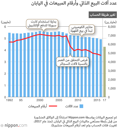 ونظرا للتغير الذي طرأ على طرق الحساب والتصنيف اعتبارا من عام 2017 فلا يمكننا القيام بمقارنة بسيطة مع السنوات السابقة، لكن الانخفاض في عدد آلات البيع الذاتي هو أمر واضح للعيان. حيث انخفض عدد الآلات، التي بلغت ذروتها عند 5.6 مليون آلة في عام 2000، إلى أقل من 5 ملايين بحلول عام 2016. ويأتي أكبر تهديد لها من المتاجر الصغيرة "الكومبيني". فبينما كانت آلات البيع الذاتي تعتمد على ورقتها الرابحة المتمثلة في إمكانية استخدامها على مدار 24 ساعة في اليوم، إلا أنها لا تستطيع منافسة المتاجر التي توفر مجموعة واسعة من المنتجات على مدار الساعة أيضا.