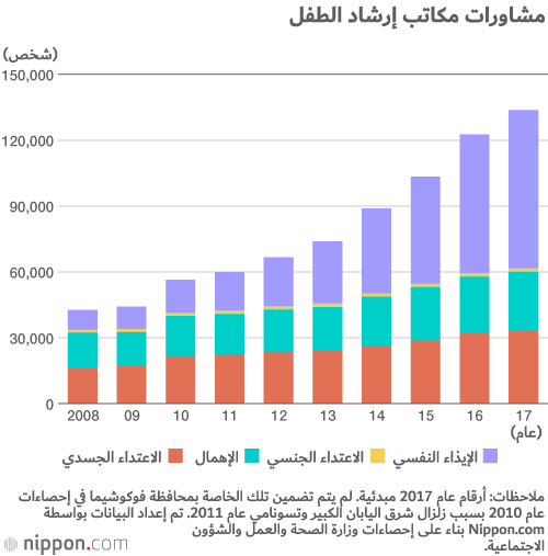 وفقاً لوزارة الصحة والعمل والشؤون الاجتماعية، ارتفع عدد الاستشارات المتعلقة بإساءة معاملة الأطفال في مكاتب إرشاد الأطفال في عام 2017 بمقدار 11203 ليصل إلى 133778 حالة، وهو أعلى رقم مسجل حتى الآن. وقد أخذت هذه الأرقام في الازدياد على أساس سنوي منذ بدء جمع البيانات في عام 1990. وقد أصبحت الوفيات الناجمة عن إساءة معاملة الأطفال قضية اجتماعية أدت إلى زيادة في تلك التقارير.