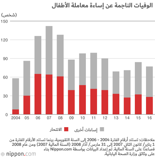 وفقاً لوزارة الصحة والعمل والشؤون الاجتماعية، ارتفع عدد الاستشارات المتعلقة بإساءة معاملة الأطفال في مكاتب إرشاد الأطفال في عام 2017 بمقدار 11203 ليصل إلى 133778 حالة، وهو أعلى رقم مسجل حتى الآن. وقد أخذت هذه الأرقام في الازدياد على أساس سنوي منذ بدء جمع البيانات في عام 1990. وقد أصبحت الوفيات الناجمة عن إساءة معاملة الأطفال قضية اجتماعية أدت إلى زيادة في تلك التقارير.