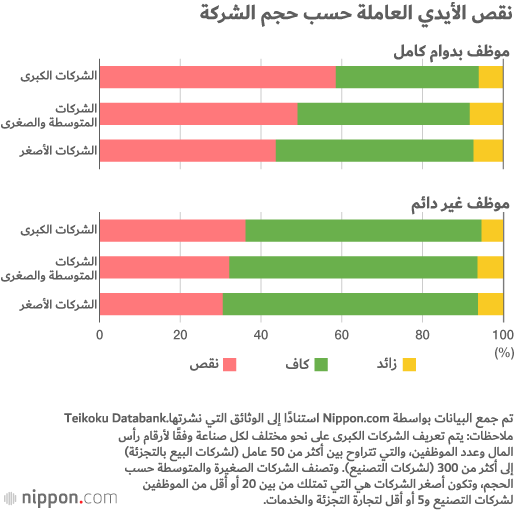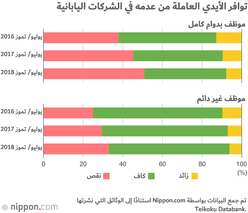 تم الكشف عن نتائج استطلاع اتجاهات الشركات بشأن النقص في الموظفين الذي أجرته مؤسسة الأبحاث الخاصة Teikoku Databank في يوليو/ تموز 2018. وللمرة الأولى أجابت أكثر من نصف الشركات التي شملتها الدراسة، 50.9%، بأن ليس لديهم ما يكفي من الموظفين الذين يعملون بدوام كامل. وقد ارتفع هذا المعدل من 37.9% في يوليو/ تموز 2016 إلى 45.4% في يوليو/ تموز 2017، وهو ما يشير إلى النقص المتزايد في العاملين في قطاع الشركات باليابان.