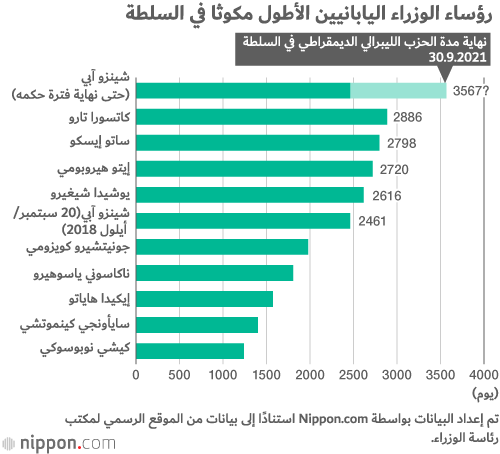 ولن تنتهي ولاية رئيس الوزراء الحالي آبي كرئيس للحزب الليبرالي الديمقراطي حتى 30 سبتمبر/ أيلول 2021، وإذا ظل في منصبه كرئيس للحكومة حتى ذلك الحين، فسوف تمتد فترة ولايته الإجمالية إلى 3567 يومًا.