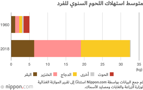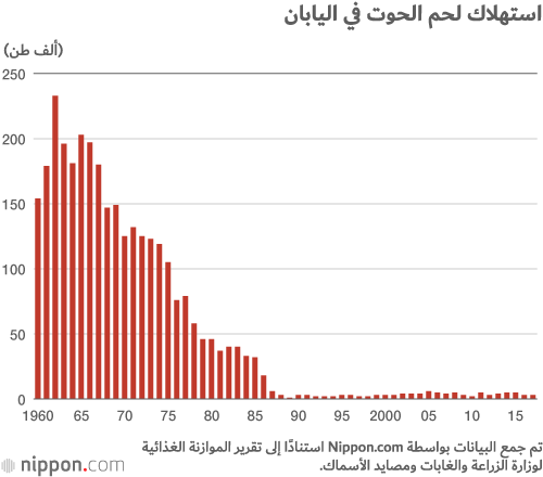 في عام 1960، بلغ الاستهلاك السنوي للفرد من اللحوم في اليابان 5.2 كغم. وحظي لحم الحيتان بـ1.6 كيلوغرام من هذا المجموع، وهو أعلى كمية بين جميع مصادر اللحوم. وبحلول عام 2017، ارتفع نصيب الفرد السنوي من استهلاك اللحوم إلى 32.7 كيلوغراما، حيث بلغ الدجاج والخنزير 13.4 و12.8 كيلوغرام على التوالي، في حين بلغ استهلاك لحوم البقر حوالي النصف. بينما تم حساب استهلاك لحوم الحيتان للفرد الواحد في نفس الفترة ليتضح أنه صفر كيلوغرام.