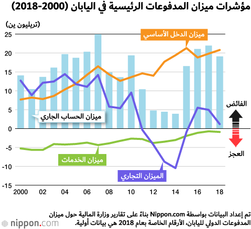 تم إعداد البيانات بواسطة Nippon.com بناءً على التقرير الأولي لوزارة المالية حول ميزان المدفوعات الدولي لليابان لعام 2018.