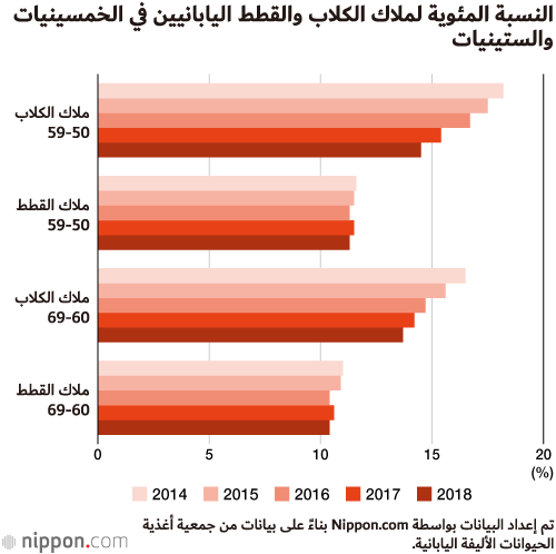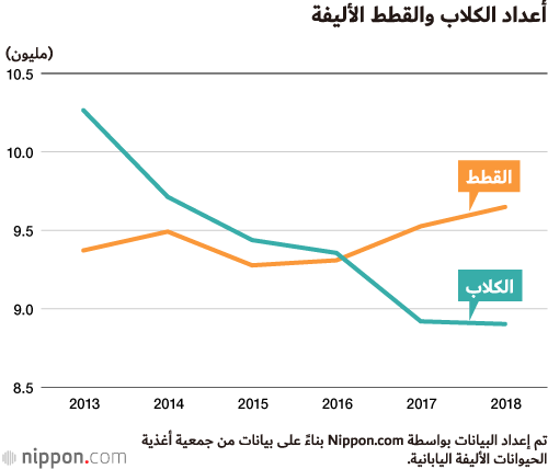 وفقًا لاستطلاع على مستوى البلاد حول القطط والكلاب التي يتم اقتنائها كحيوانات أليفة يتم إجراؤه سنويًا من قِبل جمعية أغذية الحيوانات الأليفة اليابانية، بلغ إجمالي عدد الكلاب في عام 2018 حوالي 8903000، ولكن إجمالي عدد القطط كان أعلى حيث بلغ 9649000. وقد انخفض الرقم الخاص بالكلاب في السنوات الأخيرة بينما يرتفع بشكل تدريجي بالنسبة للقطط.