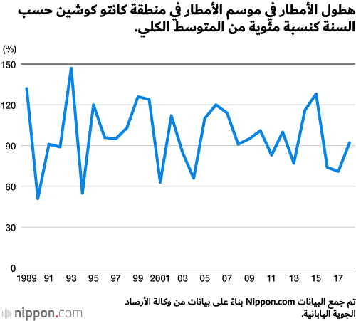 ومع قرب نهاية كل موسم ممطر، يصبح حجم المطر أثقل ويمكن أن يتسبب هطول أمطار غزيرة متكررة في أضرار بسبب فيضان الأنهار والانهيارات الأرضية. ففي الفترة ما بين 28 يونيو/ حزيران و8 يوليو/ تموز 2018، كان هناك هطولا للأمطار على نطاق واسع، لا سيما في جميع أنحاء غرب اليابان، مع بعض المناطق التي هطلت بها الأمطار بأكثر من 1800 ملليمتر.