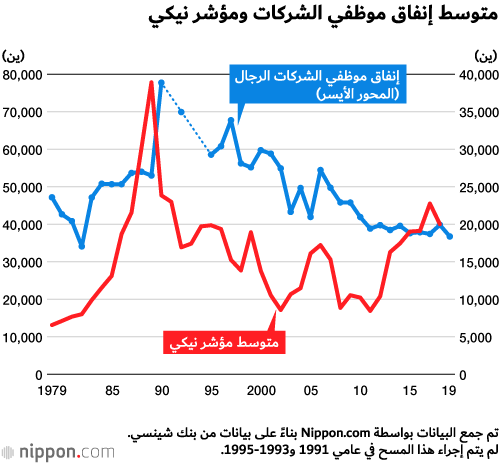 كشفت دراسة استقصائية لبنك شينسي تبحث في إنفاق الموظفين للمال أنه في المتوسط في عام 2019، كان يتعين على موظفي الشركات من الرجال الذكور إنفاق 36747 ين شهريا، أي بانخفاض قدره ين3089 عن العام السابق. يعد هذا ثاني أقل مبلغ يتم تسجيله منذ بدء المسح في عام 1979. (كان أقلها 34100 ين في عام 1982).