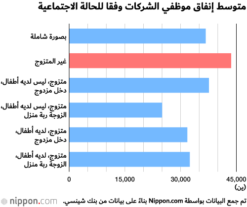 بينما كان لدى الموظفين غير المتزوجين 43608 ين، يمكن ملاحظة وجود فجوة كبيرة بين الرجال المتزوجين الذين تتراوح بين 25000 إلى 35000 ين. يميل أولئك الذين لديهم أطفال في سن المرحلة الابتدائية أو أصغر إلى إنفاق أموال أقل، في إشارة إلى أن نفقات تربية الأطفال ورسوم التعليم تشكل عبئًا على ميزانية الأسرة.