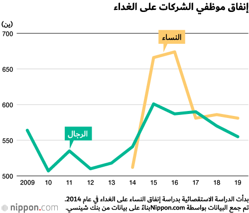 أظهرت دراسة استقصائية عن حالات غداء الموظفين في المكتب، والتي بدأت في عام 2009، أن متوسط إنفاق الرجال على الغداء في عام 2019 قد انخفض بنسبة تتراوح بين 15 و555 ين، وانخفض متوسط إنفاق النساء بنسبة 5 إلى 581 ين.